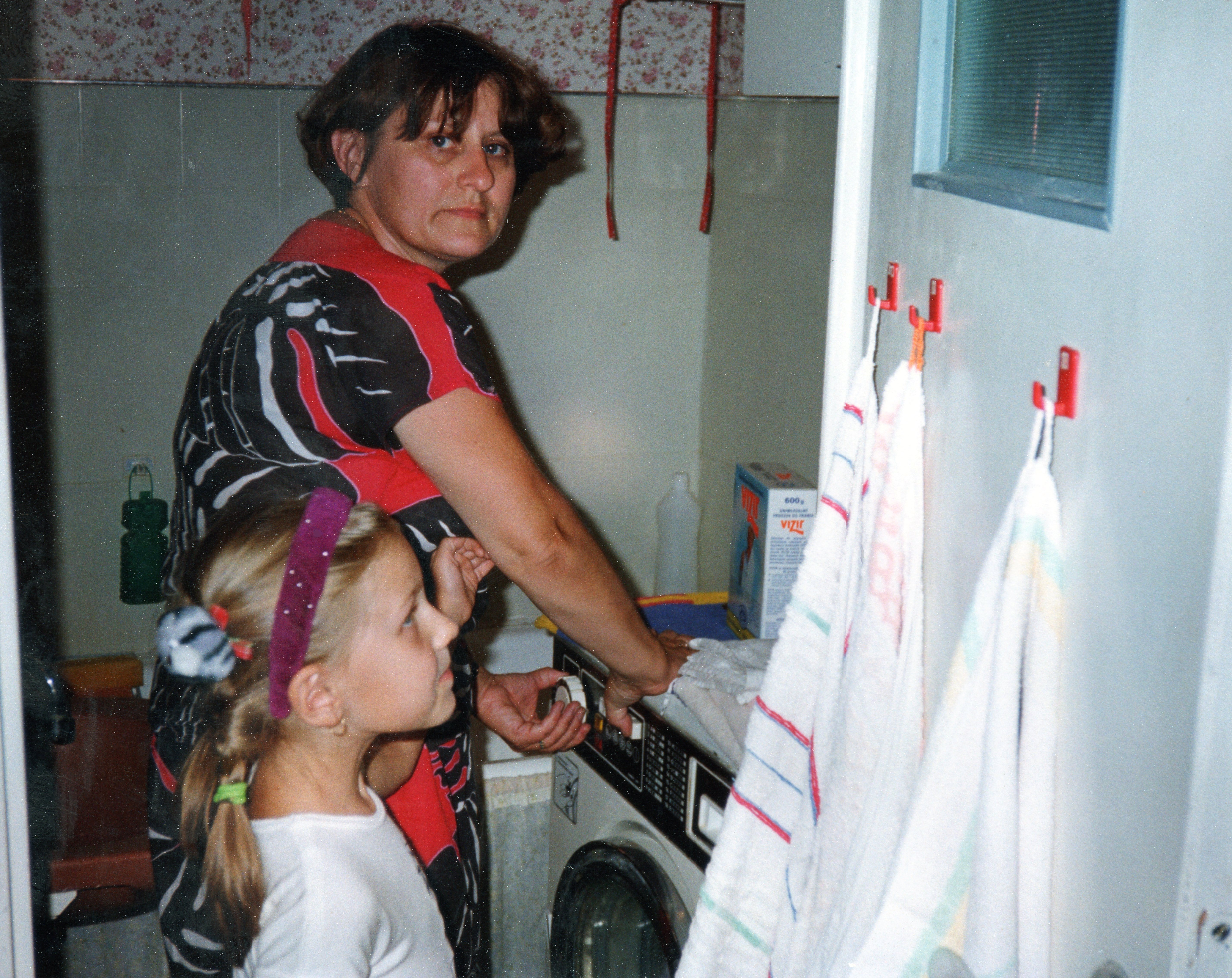 Na trzecim zdjęciu jest mama, która akurat wstawia pranie, a ja obok, niby przypadkiem w tej naszej mikrołazience, przezornie nie patrzę w obiektyw.