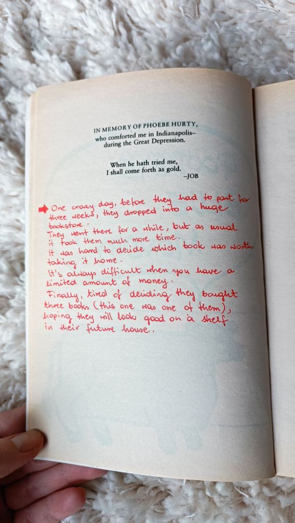 Dla mnie, pisanie po książkach było czymś w rodzaju świętokradztwa, ale postanowiłam, że nie można być takim sztywniakiem i kiedy książka trafiła już do mnie, dopisałam parę akapitów od siebie.